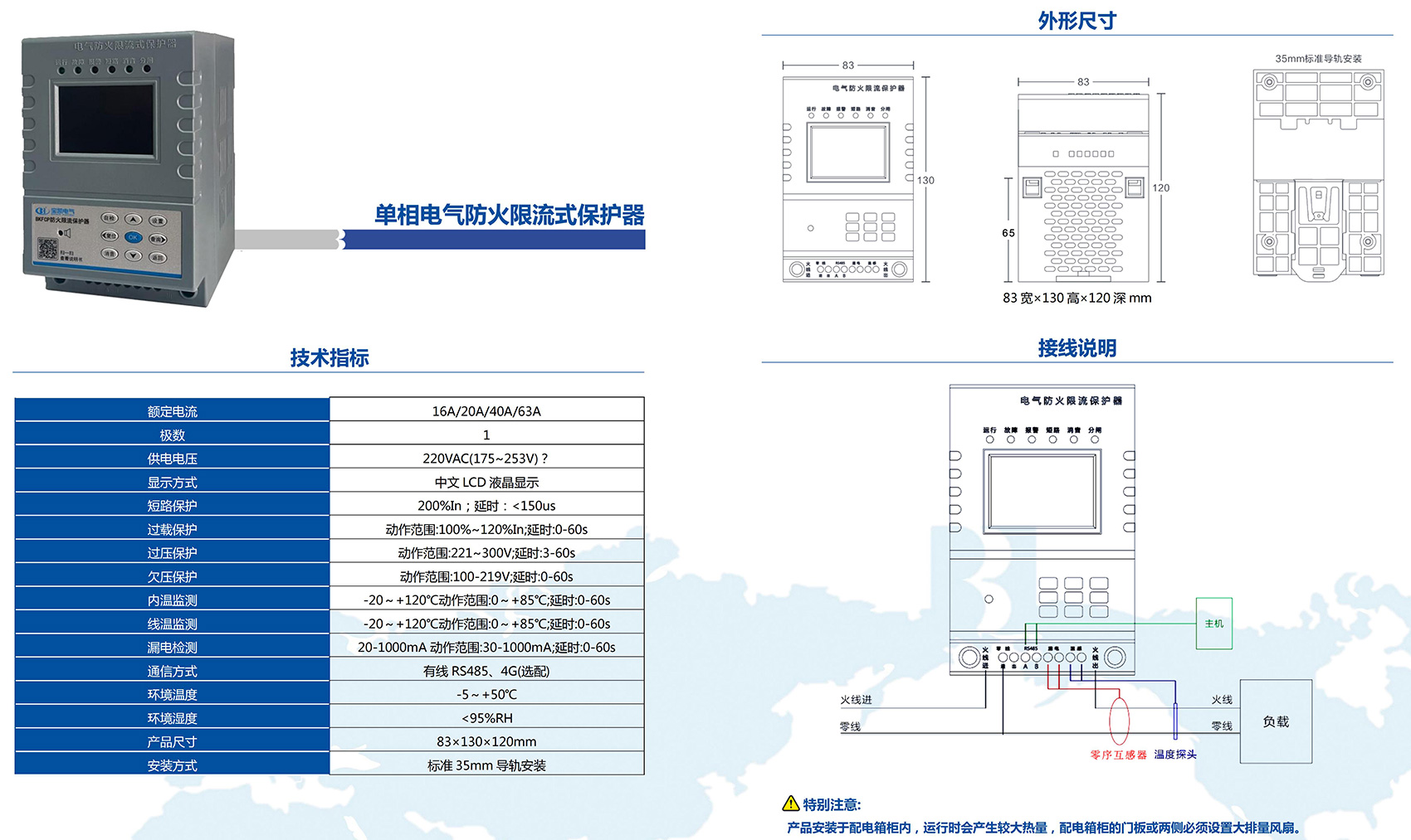 BKFCP系列电气防火限流式保护器,是一款能实时准确检测出用电回路的电流,并能以微秒级速度快速限制短路电流以实现灭弧保护,并集电压、电流、频率、温度(选配)、漏电(选配)等多种功能于一体,且具有智能化分析能力的新型用电安全监控装置。当被保护线路中发生短路故障时,电气防火限流式保护器能以微秒级速度快速限制短路电流以实现灭弧保护,在由短路产生的电流远未达到短路电流前就完成限流,从而预防电气线路短路过程中引起的连续拉弧打火等引燃可燃物造成的火灾事故,保障使用场所人员和财产的安全。